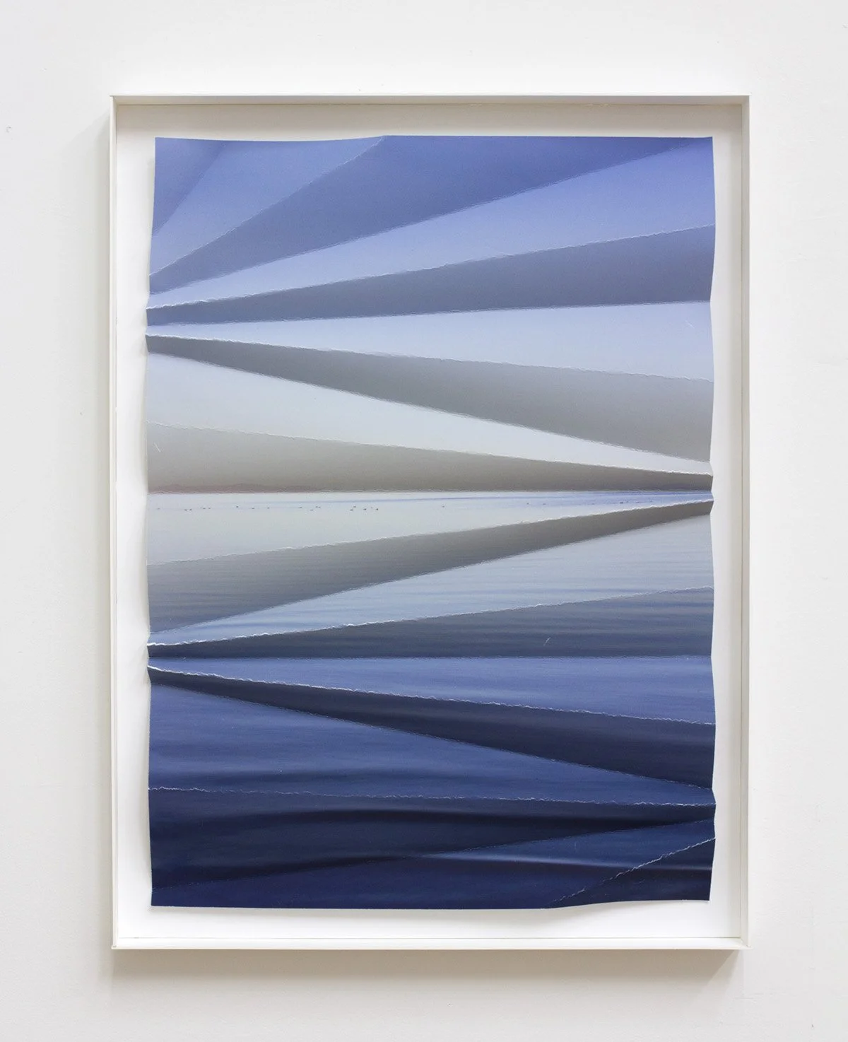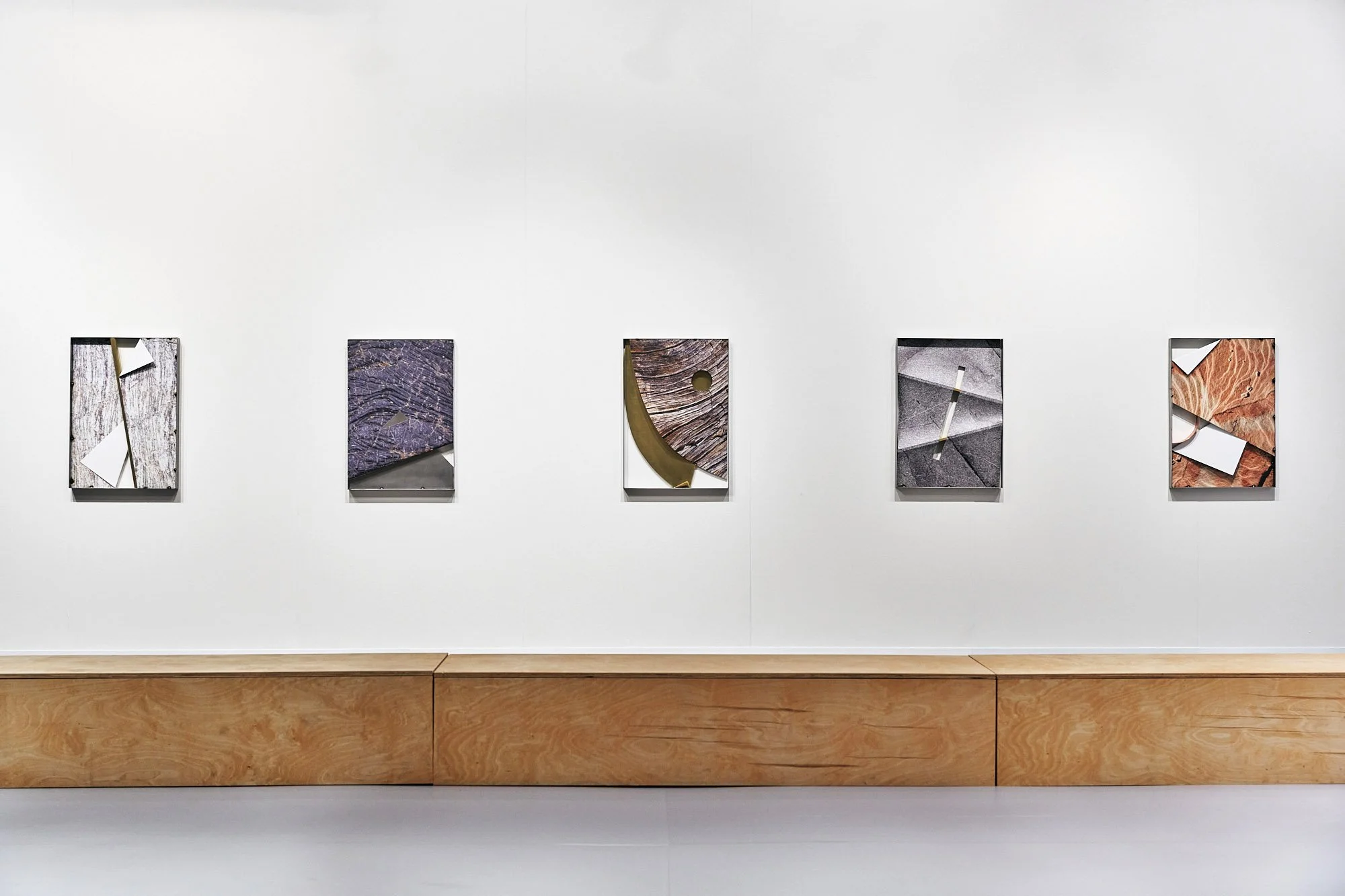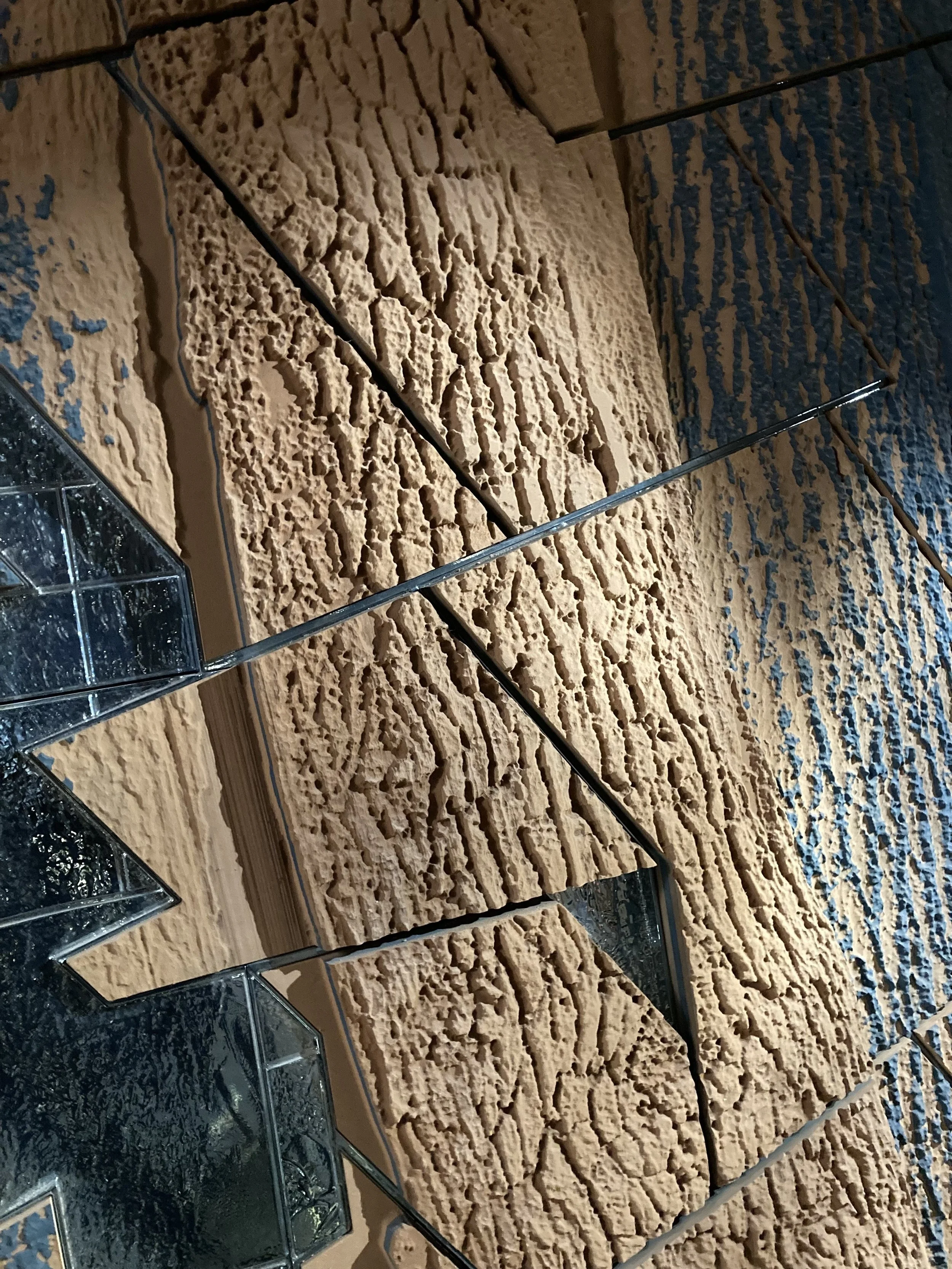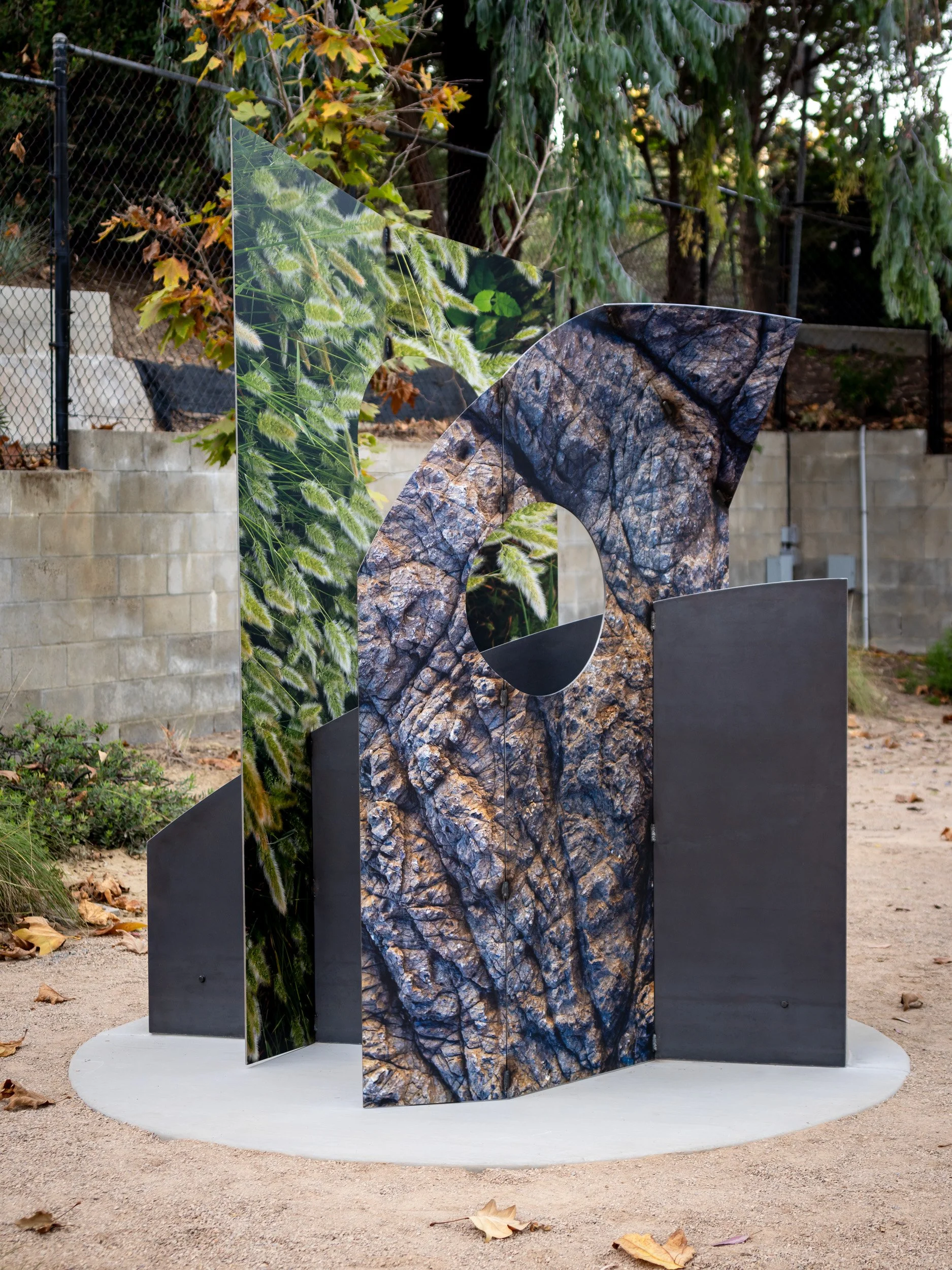 Like the parlor game, “exquisite corpse,” the artists created digital artworks for Information Stream that were then fed into Kogan’s machine learning model. Each “rock” cluster, made of colored, laminated Valchromat MDF, is a singular contribution that represents the artists’ respective practices. The AI-generated images, made of UV prints on mirror-finished, polished metal, show reflective water flowing between the rocks.