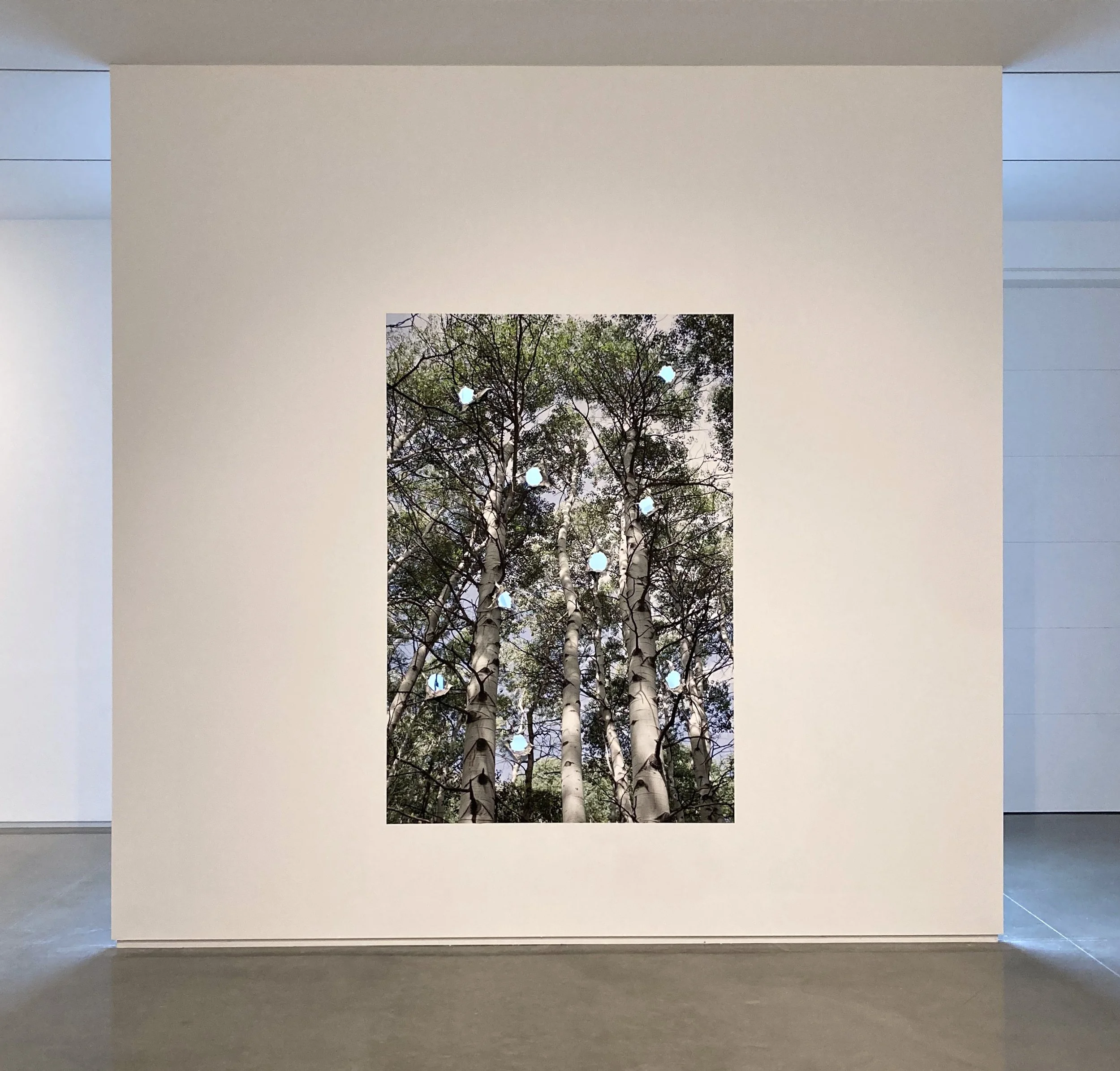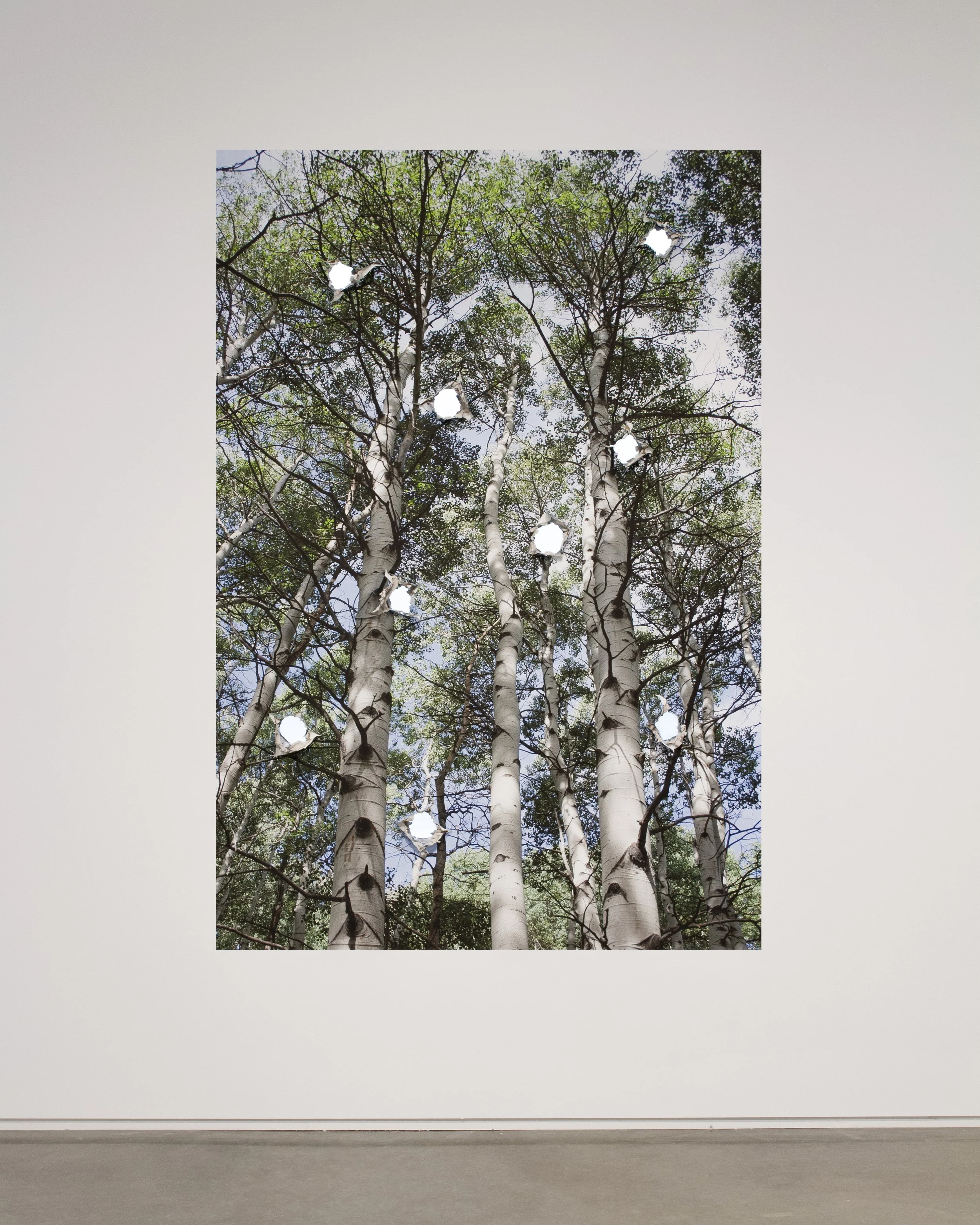 Aspen Grove Breakthrough, 2024 Adhesive backed archival pigment print, wall, holes. Print size 56.5"w x 85"h. Installation at Center for Maine Contemporary Art, Rockland, ME.