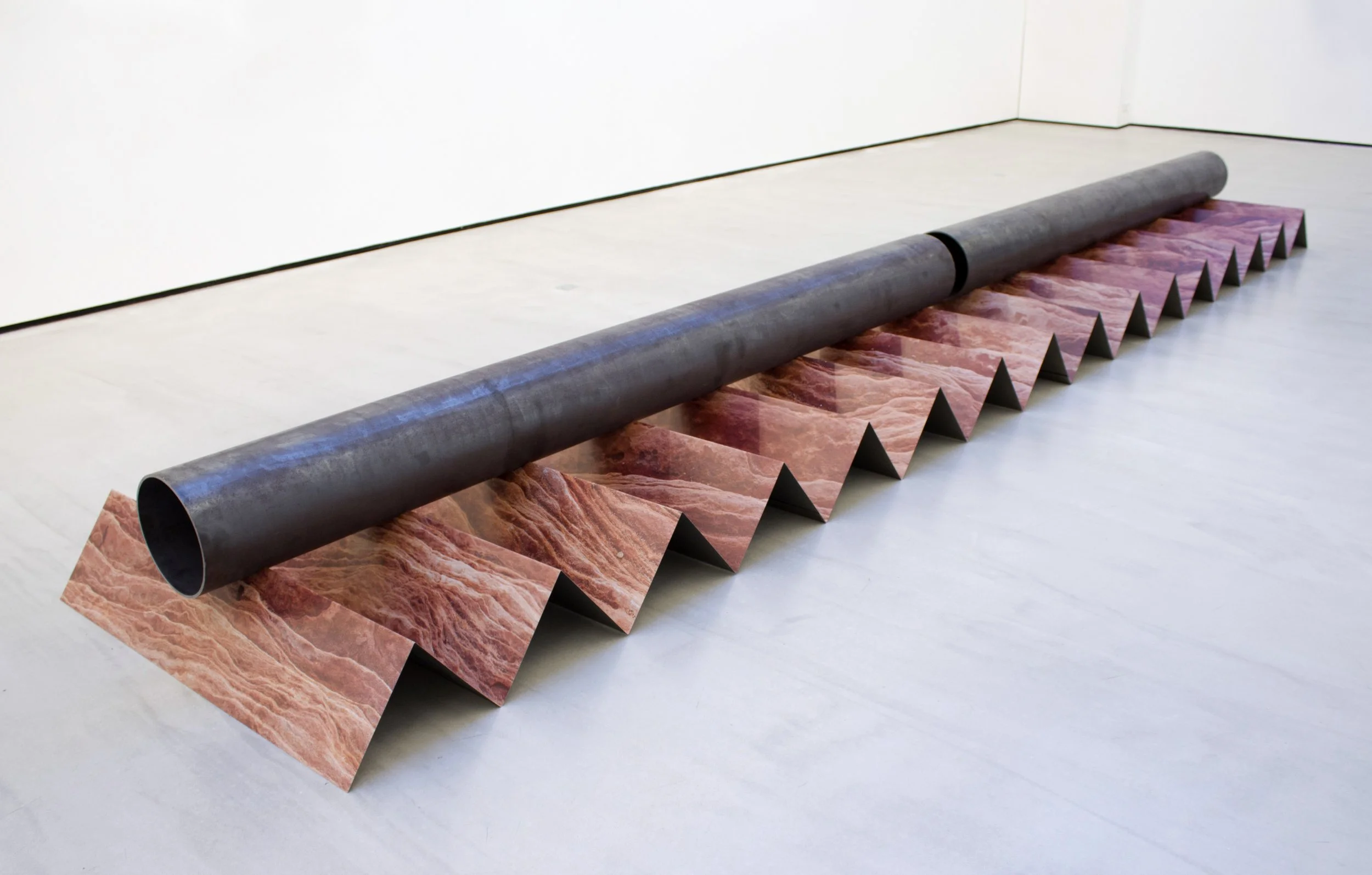 Valley of Fire Pipes, 2016, UV prints on steel, steel pipe. Installation at Galerie Christophe Gaillard, Paris, FR.