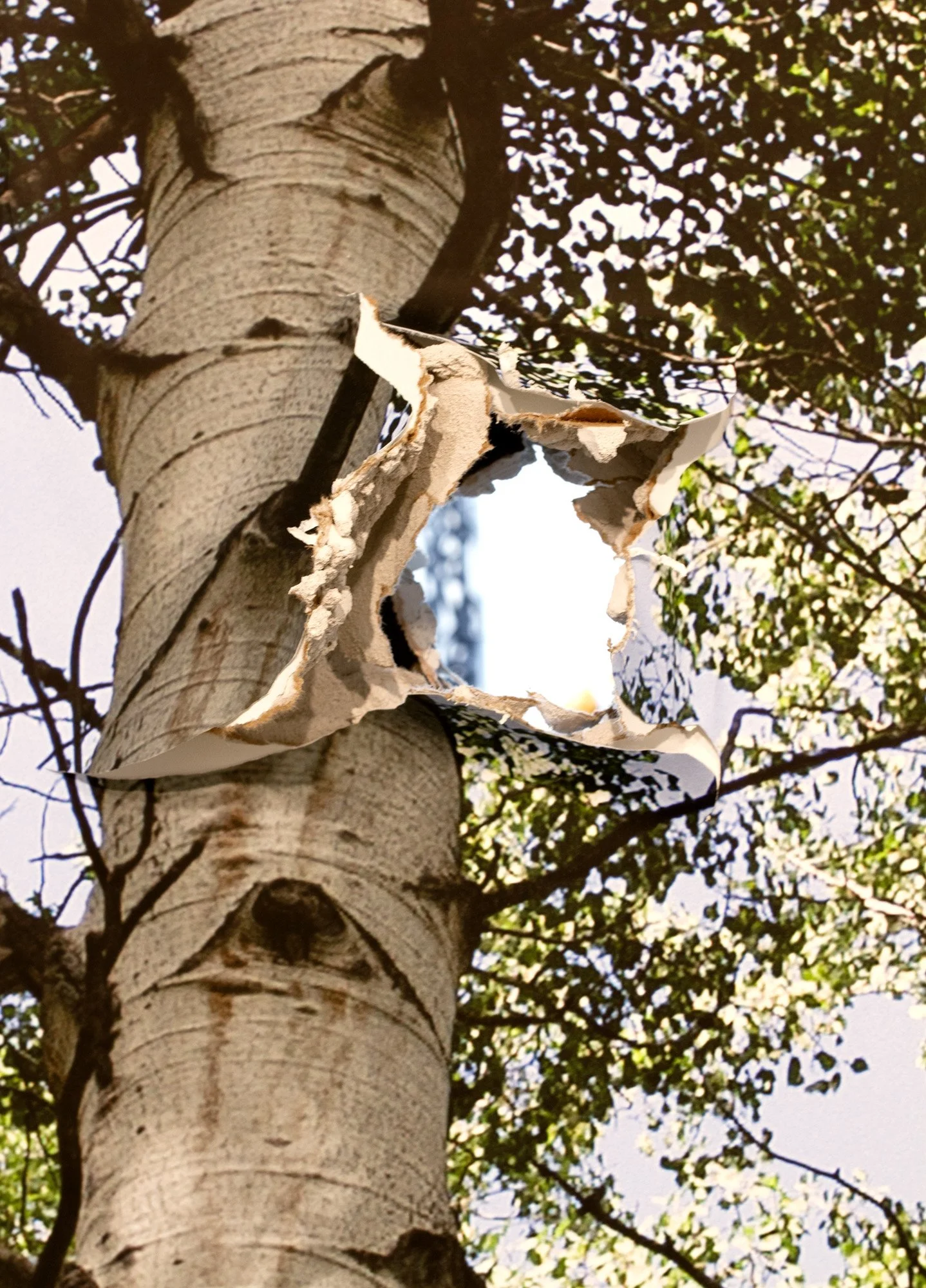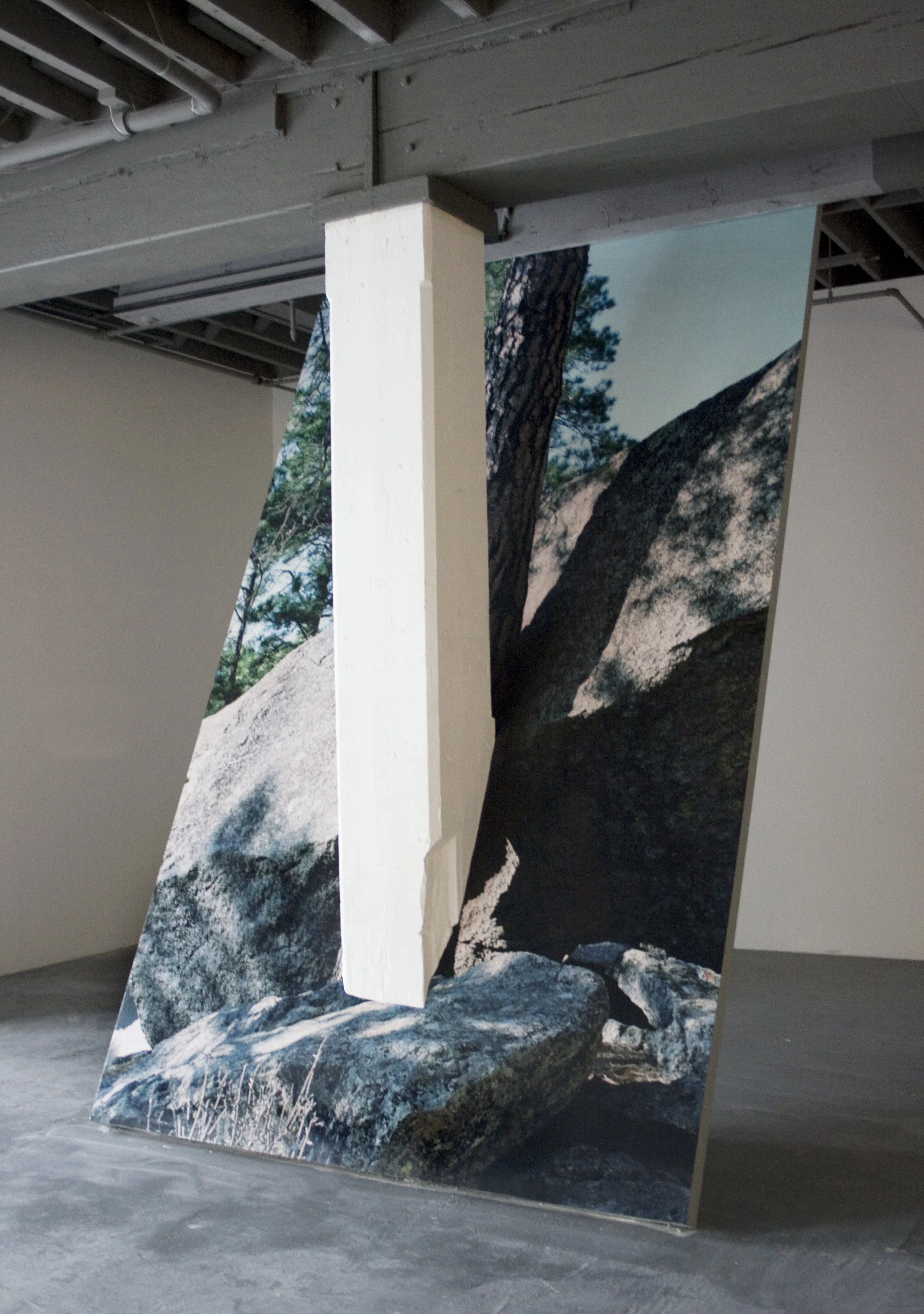 Ghost of a Tree, 2012 Digital print on Vinyl, Drywall, Wood, Wood Column, 120" x 96" x 168". Installation at Bemis Center for Contemporary Arts, Omaha, NE.